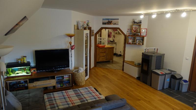 Ein zentral im Wohnzimmer situierter automatischer Pelletsofen mit Sichtglas sorgt für romantische Wärme in der großen Wohnküche. Die integrierte Zentralheizung samt 300 Liter Pufferspeicher temperiert die gesamte Wohnung. Warmwasser wird ganzjährig über einen eigenen Elektrospeicher bereitet.