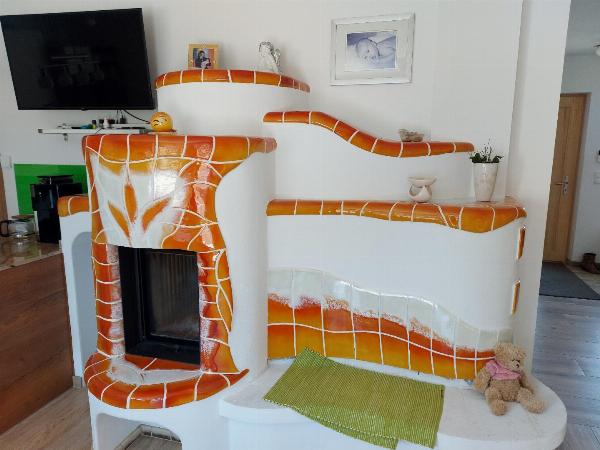 Das Zentrum des Hauses befindet sich im Wohn-/Essbereich im Erdgeschoss. Der Kachelofen dient nicht nur als dekoratives Element sondern lädt zum Verweilen auf der Ofenbank ein.